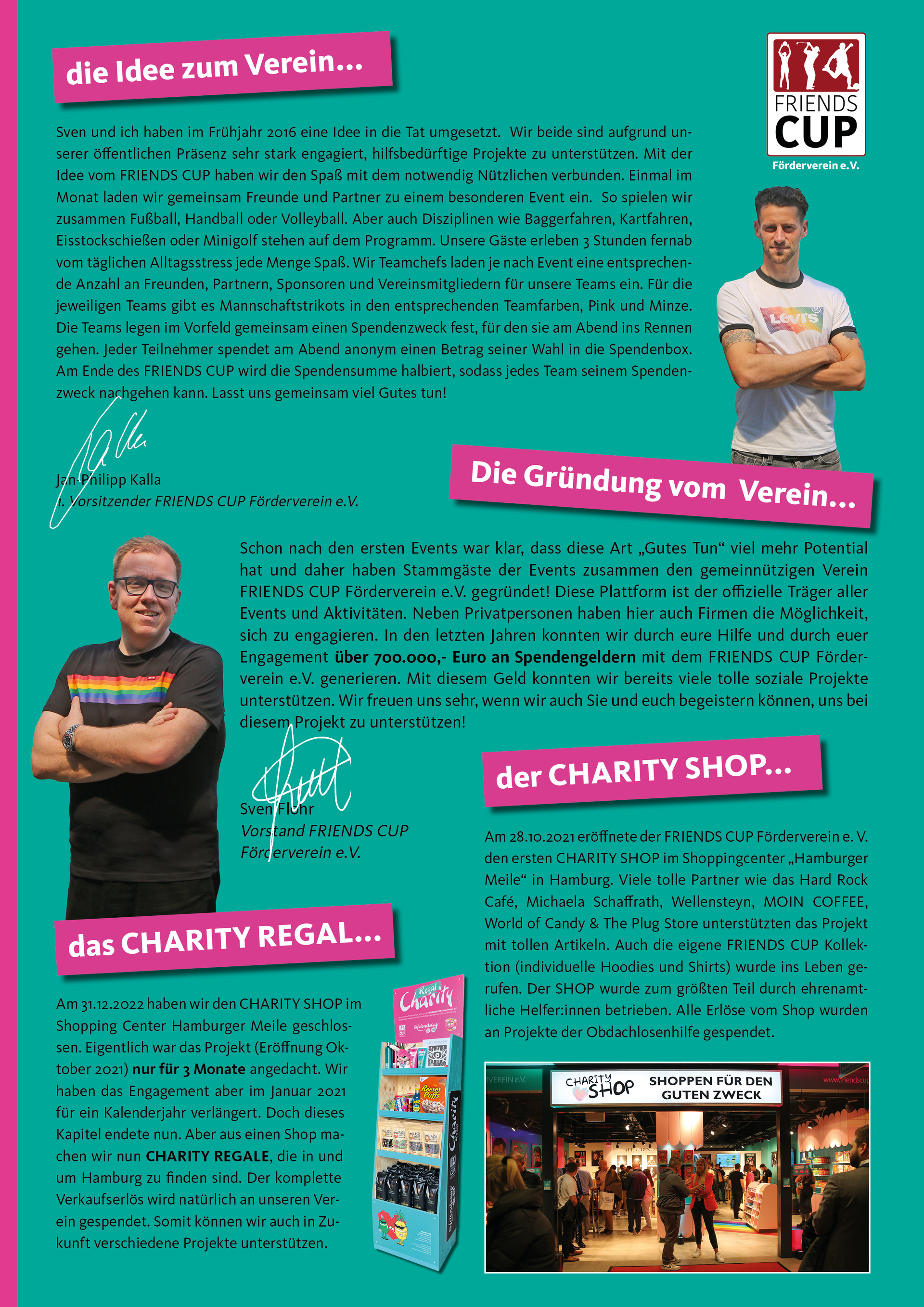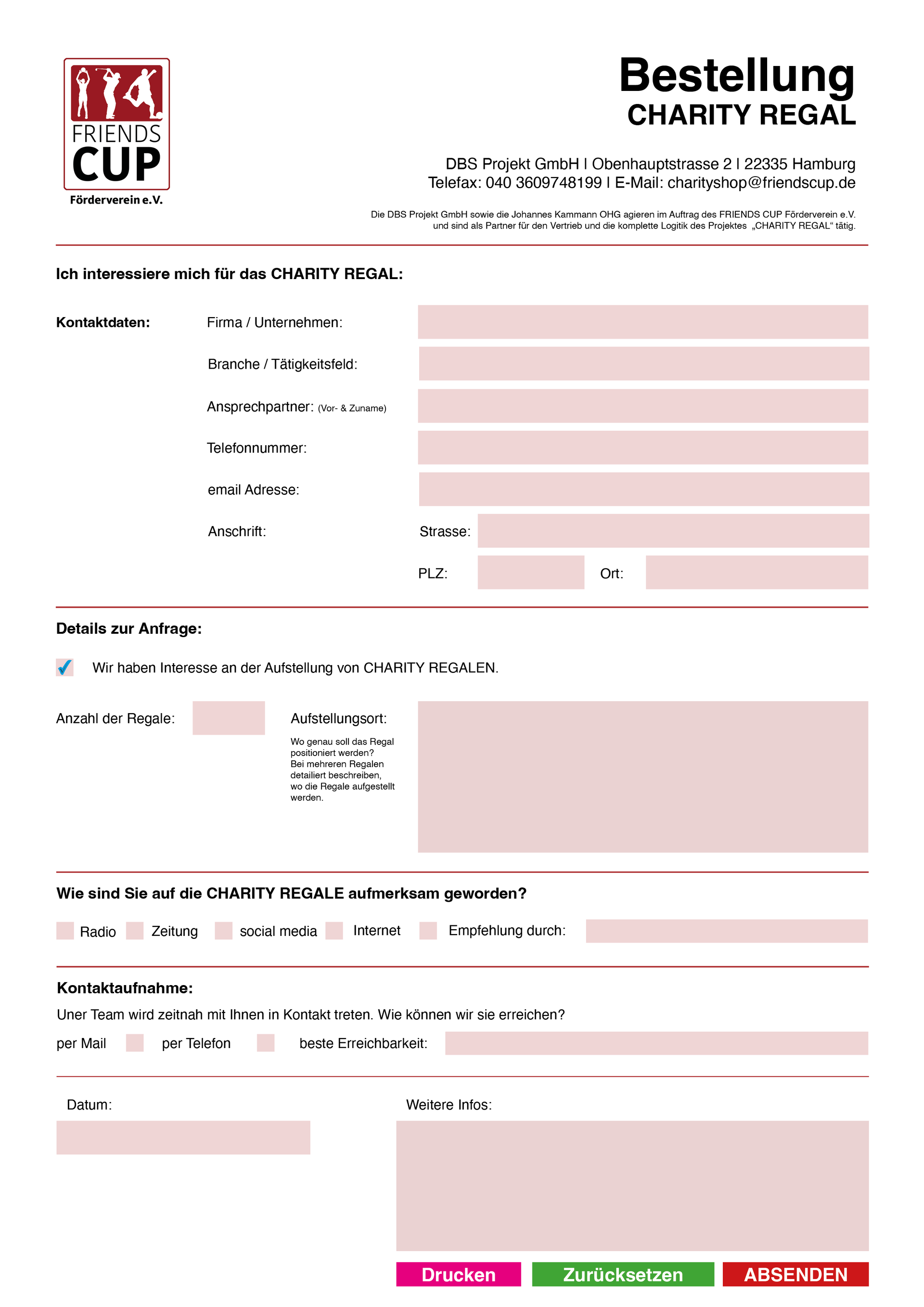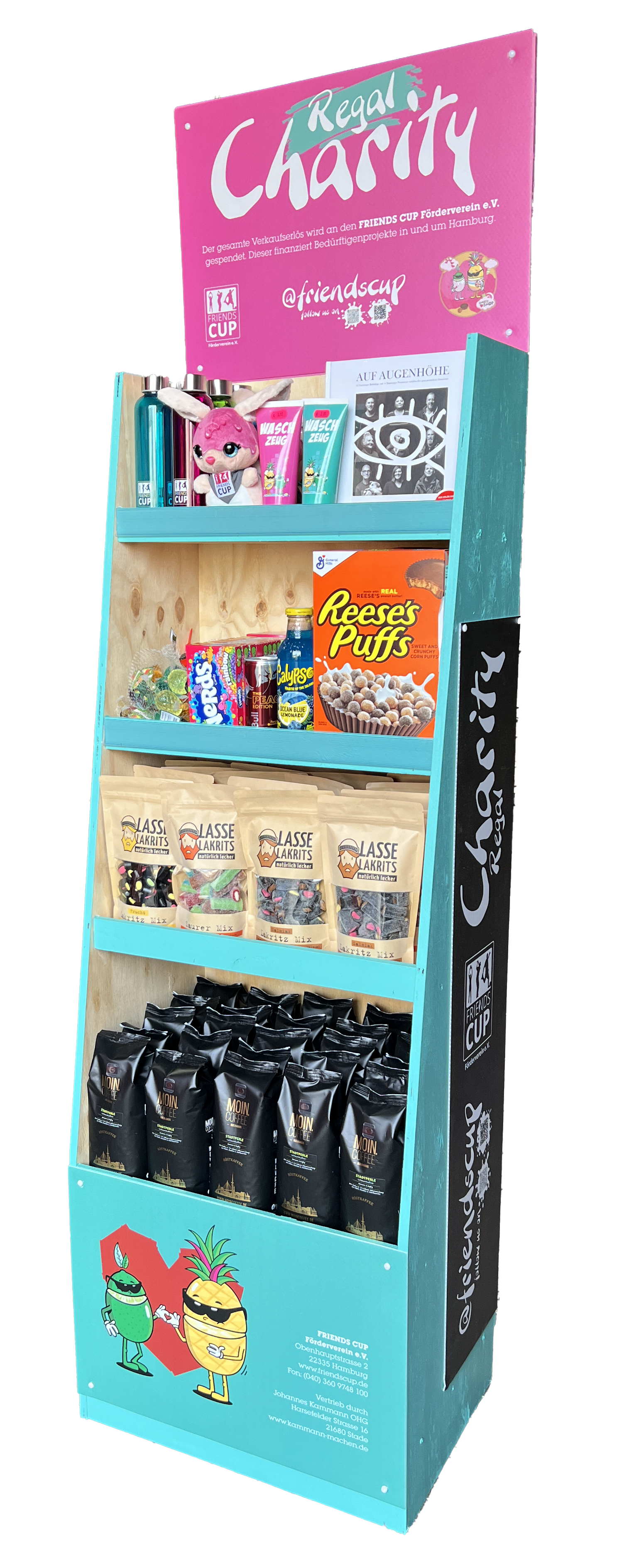 Wir sorgen für die Erstlieferung und die regelmäßige Nachlieferung inkl. perfektem Service. Wir stellen als Leihgabe das Charity Regal! Vom Verkaufserlös wird ein Anteil an den FRIENDS CUP Förderverein e.V. gespendet.
